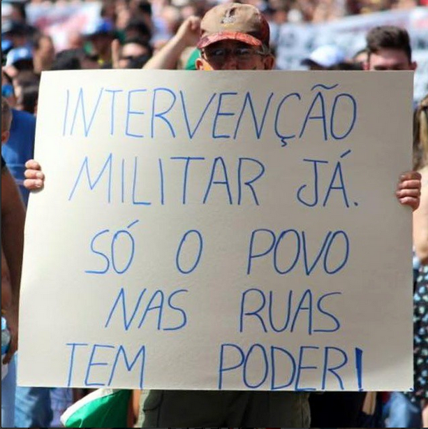 Pessoas com cartazes que pediam uma intervenção militar, isso mesmo, indivíduos livres usufruindo da democracia, “protestando” à favor da retirada dos seus DIREITO de protestar! No mínimo, para evitar ser grosseiro, essas pessoas faltaram às aulas de geopolítica e história do Brasil. E o que mais parece confuso é o fato de algumas pessoas que viveram o período da Ditadura estarem estarem envolvidos com o tal pedido de intervenção militar.