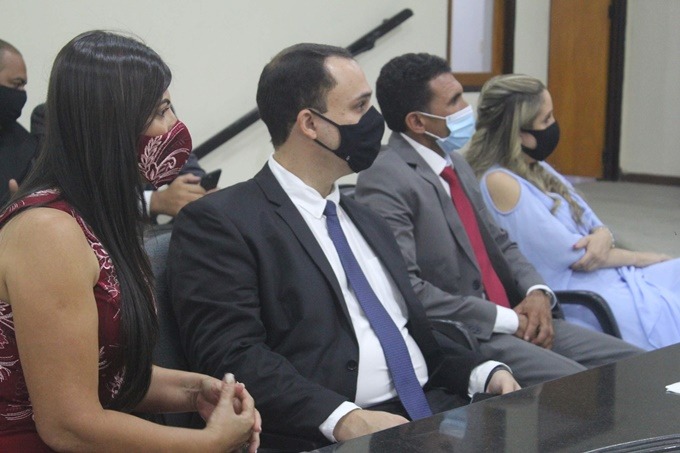 Prefeita e seu vice Iury, ao lado de seus companheiros, na posse na Câmara de Santana (Foto: Lucas Malta / Alagoas na Net)